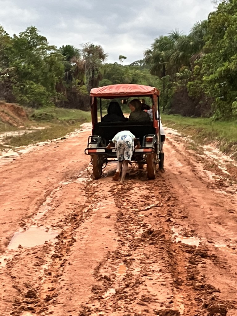 Today we leave for Eladio’s place. I purposely take my time getting ready, knowing this is the last air conditioning I will have for the next 10 days. Unable to languish in my room any longer, I reluctantly close the door on all that delicious, cool air and we all commence on our journey: first a bus ride, followed by a boat ride—about 4.5 hours total. This time of year is hot and wet in the jungle, so by the time we leave the boat, it’s raining hard (which helps bring the temperature down, but not by enough to be comfortable, IMHO). As we disembark, we hurriedly get under cover so we can change into our rubber boots, then we all hop onto a motocarro (a 3-wheeled transport similar to a tuk tuk or motor rickshaw)—a vehicle that is ill equipped to handle the thick, red jungle mud. Only 2-3 passengers fit into each motocarro, so there are a few of us making up a random procession, each with a young local boy (or two) hanging from the back. At first, I thought the boys were just hopping on a for a joy ride, but then I realized there was a purpose—when the vehicle got stuck in the mud, they hop off and push from behind. We go on like this–bumping and swerving in the clay-like mud, the boys hopping off and pushing, looking like they’re having a grand ol’ time–for about 30 minutes when we finally get to the path that leads to Eladio’s place. We hurriedly walked the last bit to get under some shelter.