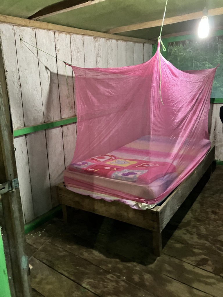 We are shown to our rooms, which are sparse and consist of a twin bed covered with mosquito netting and a table. The walls and floors are thin and made of the same bare planks, providing no sound protection or even much floor stability. When anyone walks on it, you can feel the entire floor vibrate.