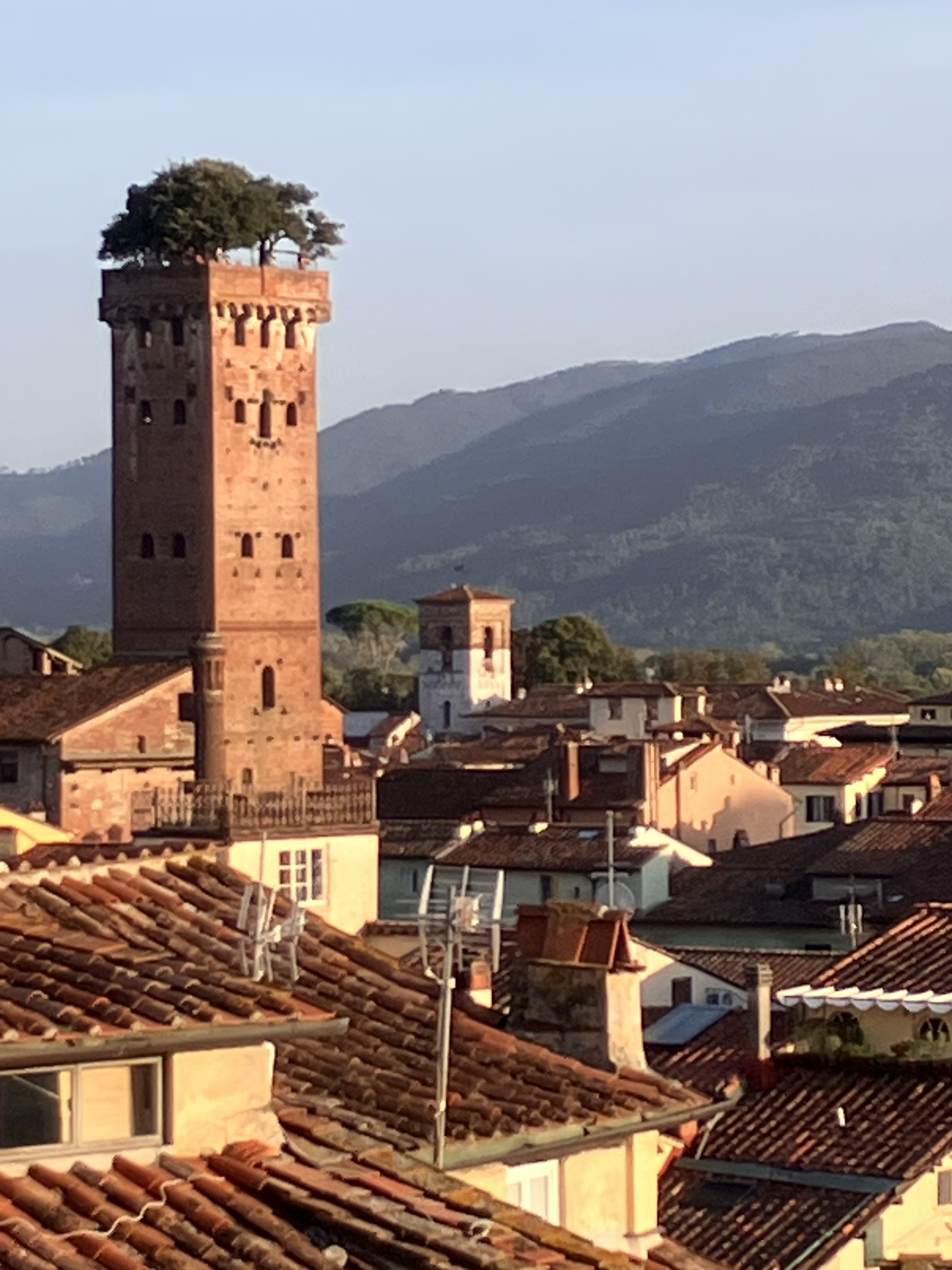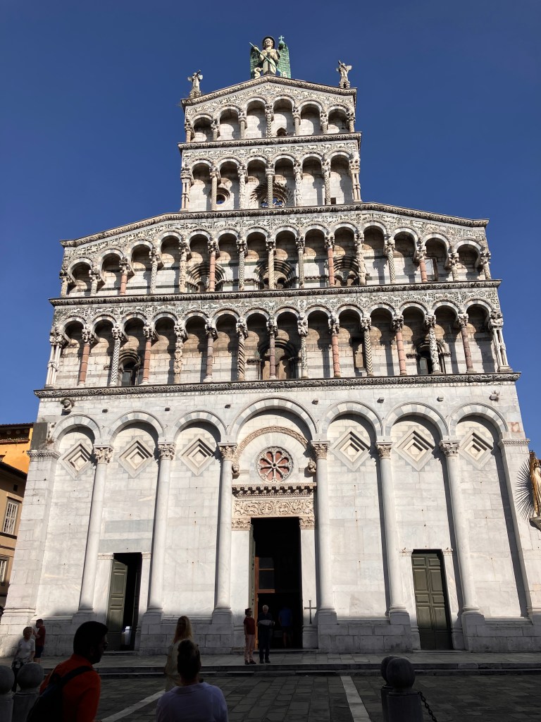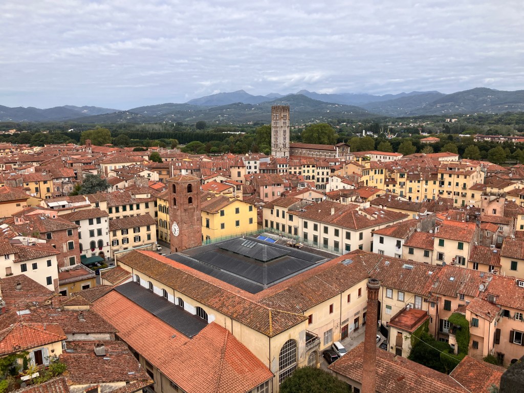After energizing myself with my walk, it was time to enter the old town itself. There were no walking tours available (it’s a weekday in the off season), so I used an interactive map to guide me to all the sites, starting with the Guinigi Tower, which was built in the 14th century by a wealthy merchant family. Aside from the fact that it’s one of the few towers that remain in a city that was once full of them, Guinigi is unique because it’s the only one with a garden of oak trees on top of it, which are meant to stand as a symbol of rebirth. I climbed the 233 steps to the top of the tower and enjoyed a beautiful view of the terracotta roofs below and the mountains beyond.