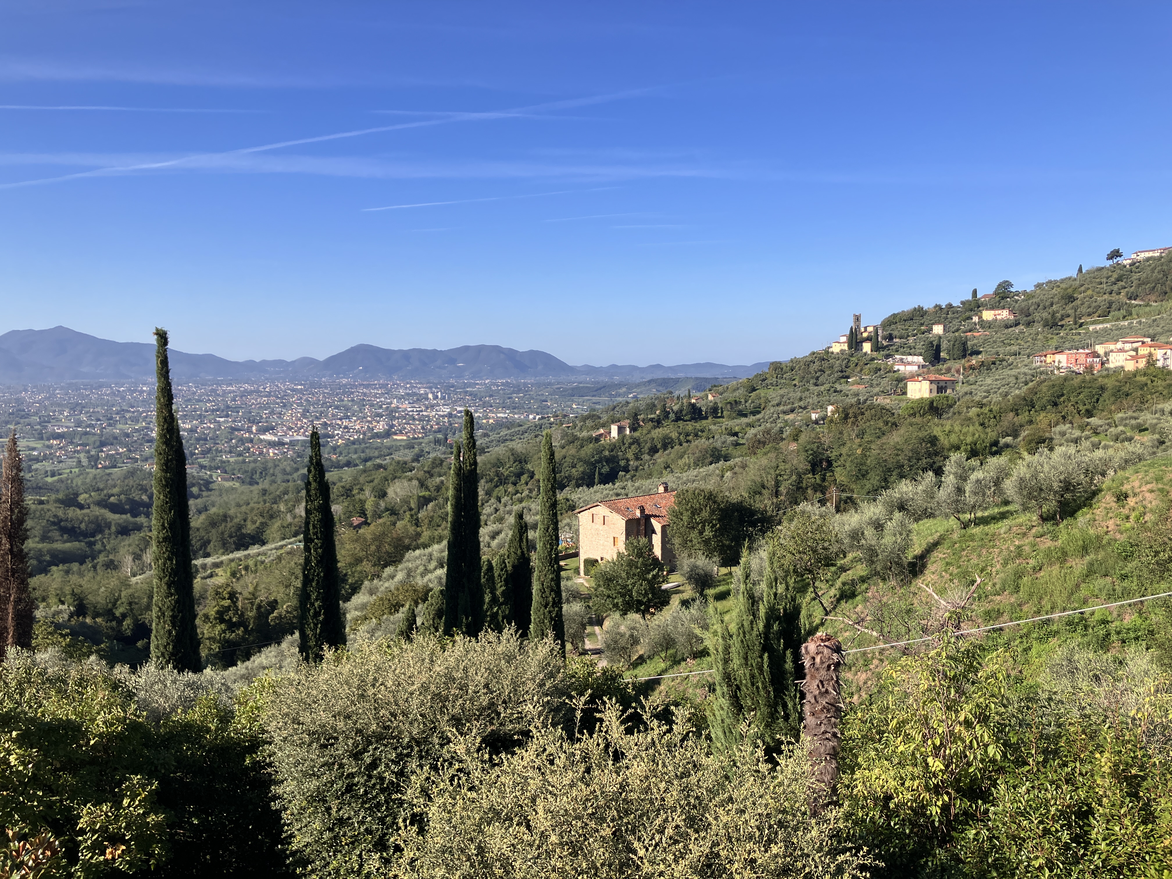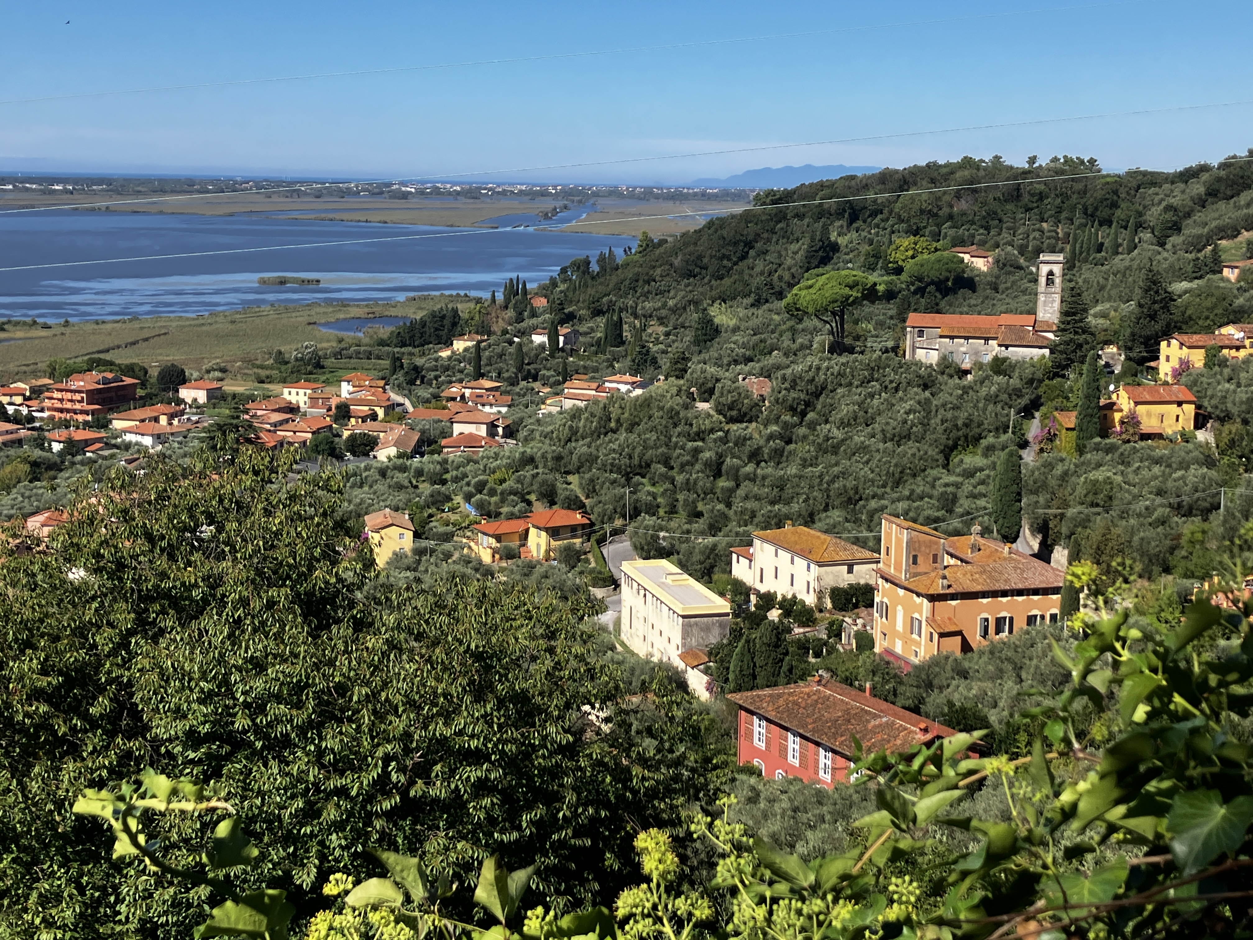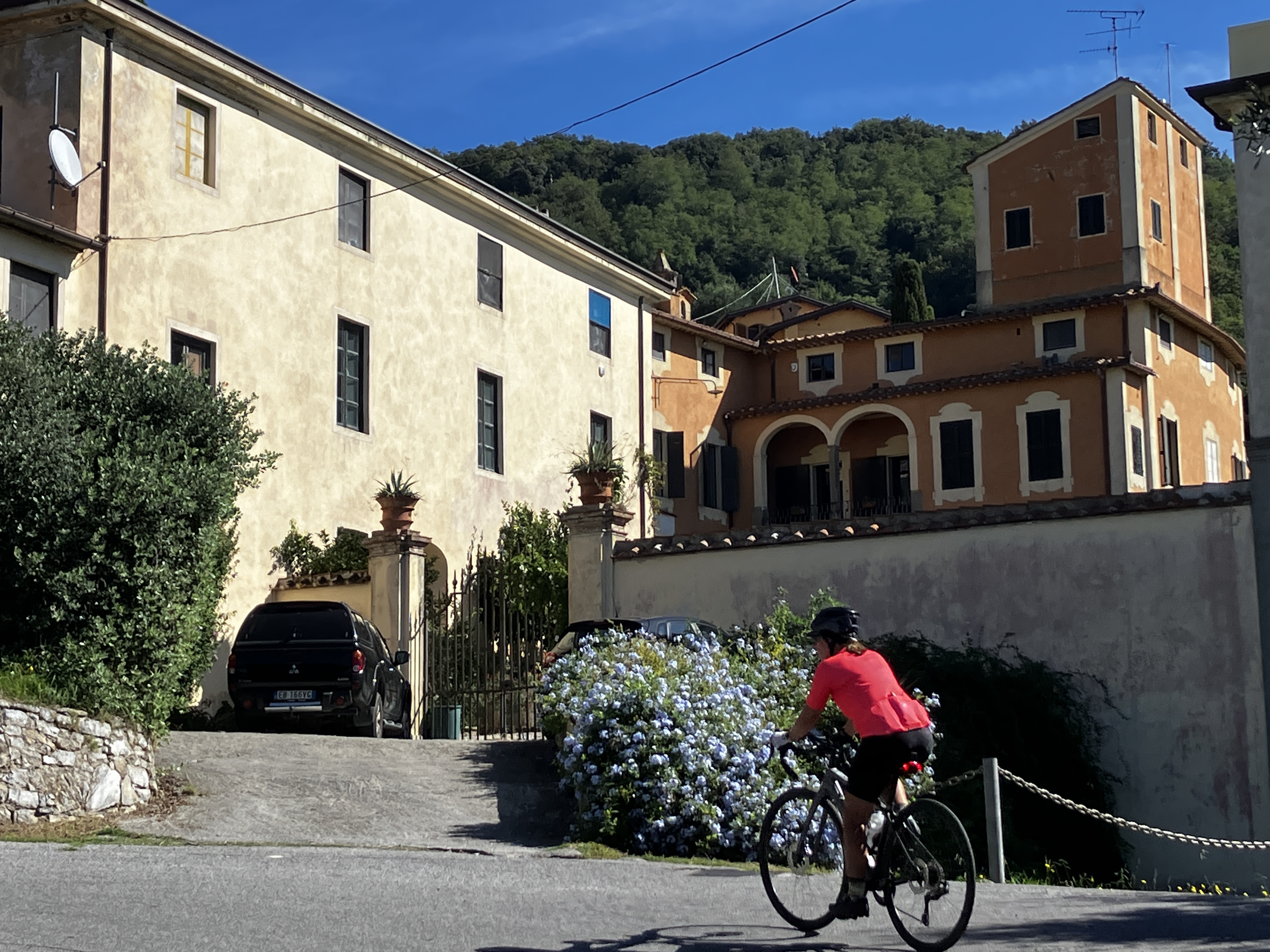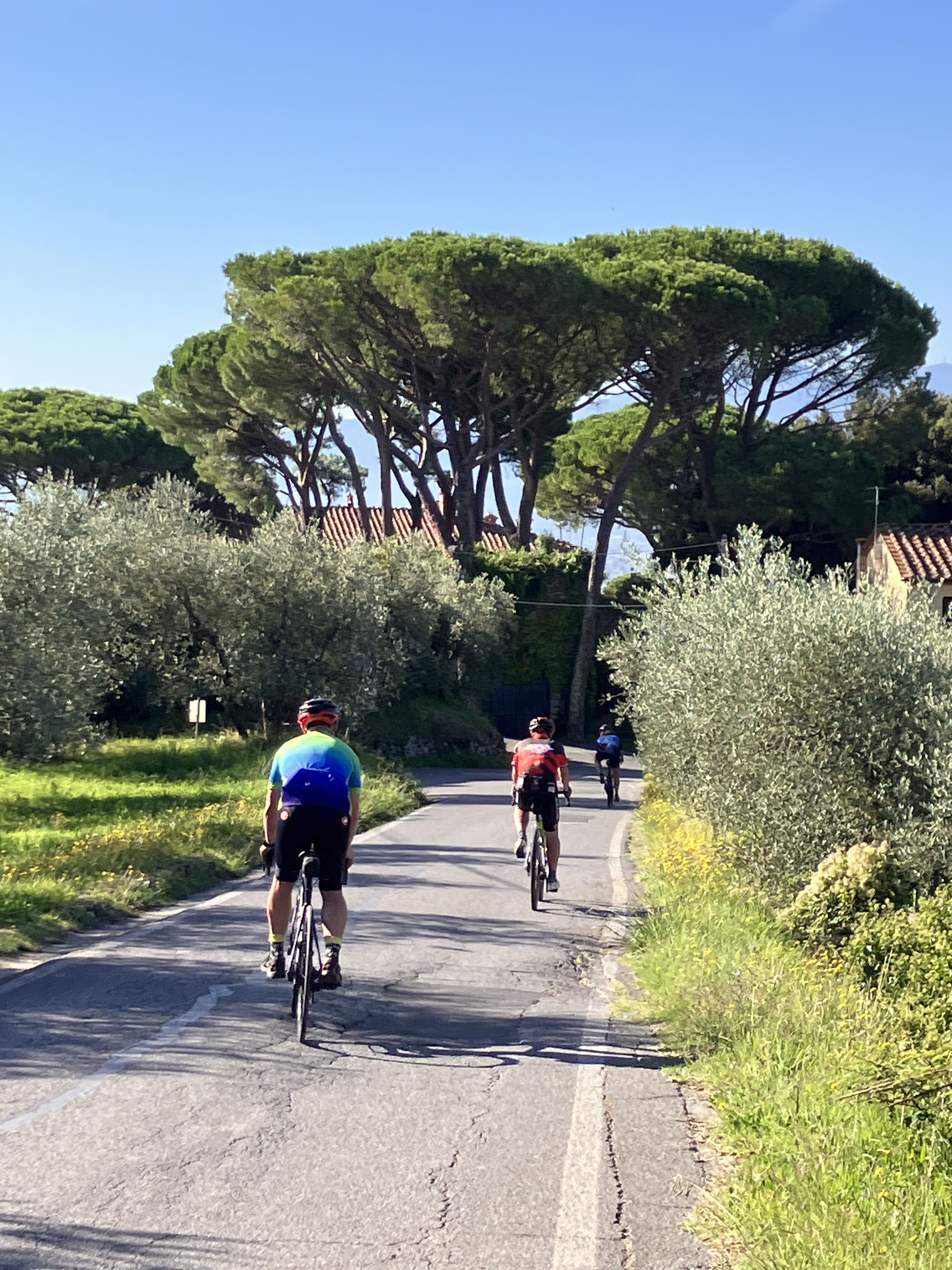 Day 6: North hills, 38 mi, 2825 ft. A big storm is coming that threatens to derail our last day of riding, so as a group we decided to choose the route we wanted to do most from the two that remained: one longer, but flatter, and one shorter, but hillier. Given that we loved the views from yesterday’s ride, we chose hills…and hills we definitely had, beginning with nearly 10 miles of climbing that began with a gentle incline, then got much steeper after about five miles. Like yesterday, the road up the hill was narrow and winding, with hairpin turns that snaked up the hillside, taking us through little hillside villages along the way. After our biggest climb was done, we treated ourselves to a cappuccino break at a lovely restaurant that offered views of Lake Massacciuccoli below. Then, it was time to descend. Normally, the descent is the “dessert” after a hard climb—something to relish and enjoy. However, the hairpin turns meant lots of blind spots where we couldn’t see oncoming cars on the narrow road, plus the road itself was in poor repair in many spots, with large holes and uneven grades. The result was a steep, brake-gripping affair that made my hands cramp and my breaks squeal. Thankfully, with the big descent over, we had several smaller hills and descents to enjoy. It was yet another beautiful day of riding.