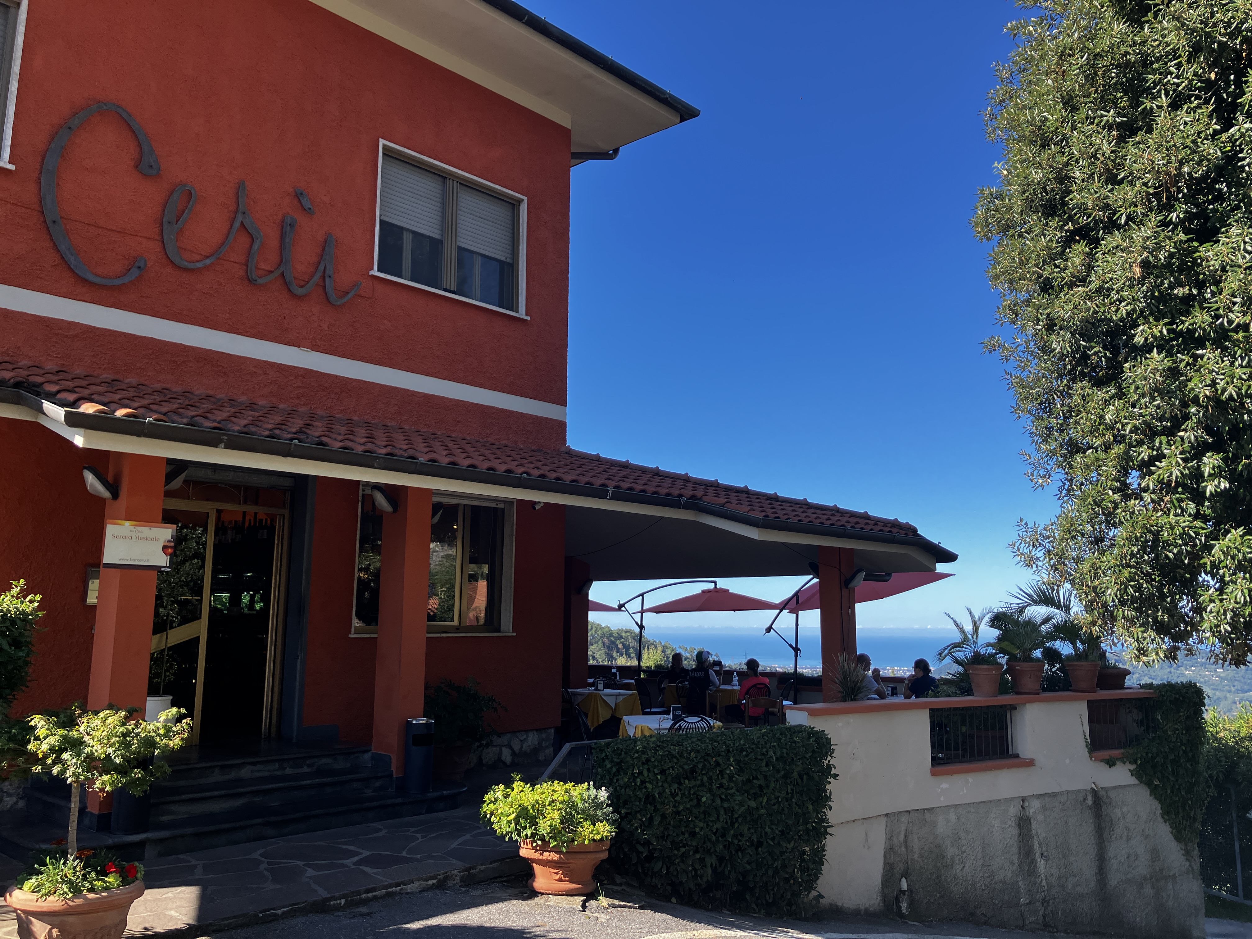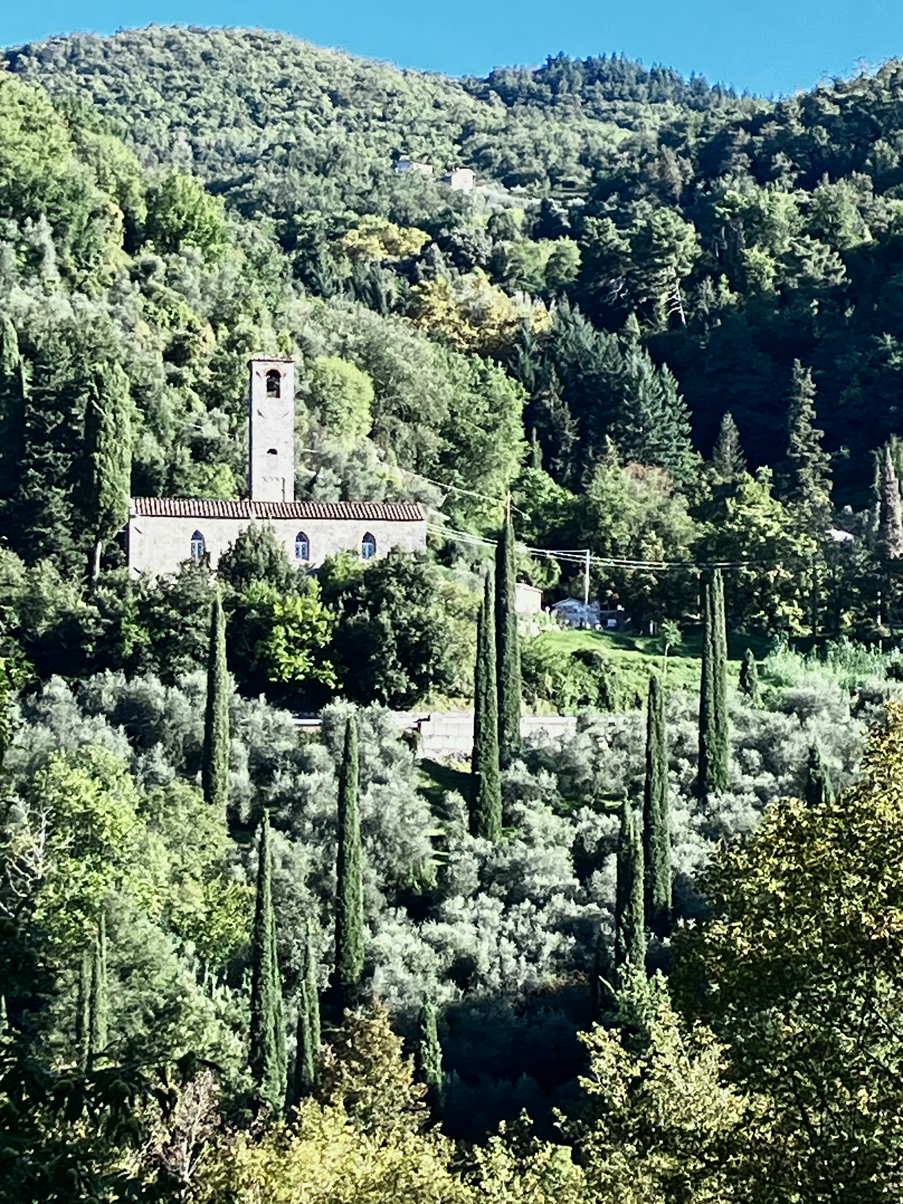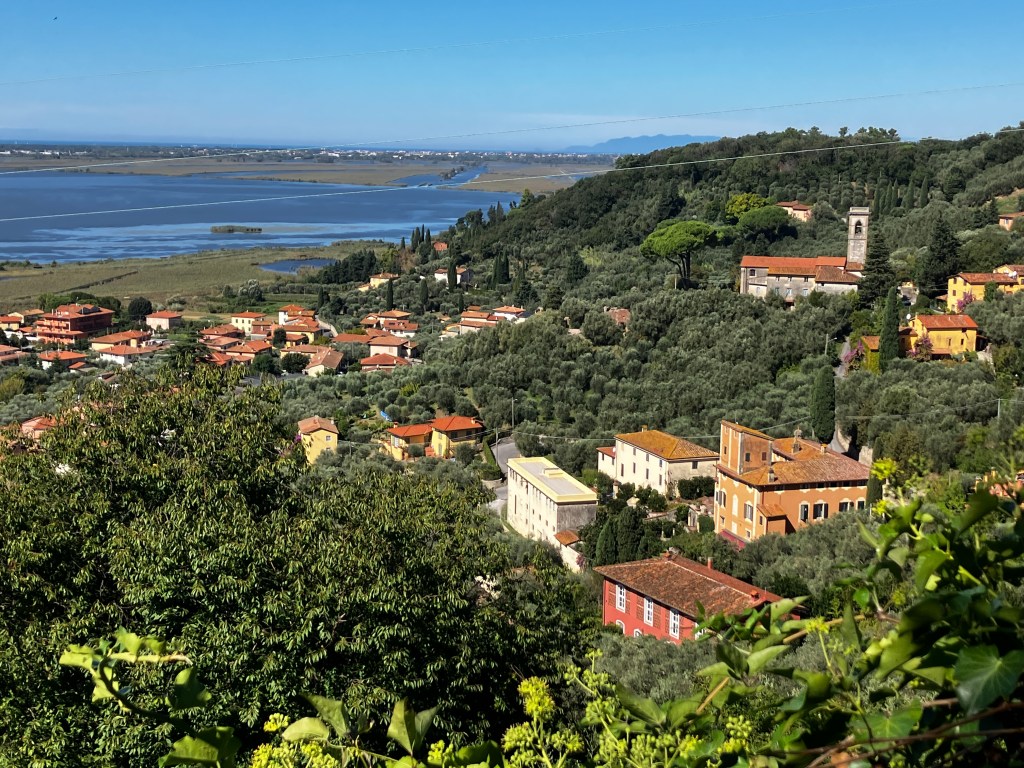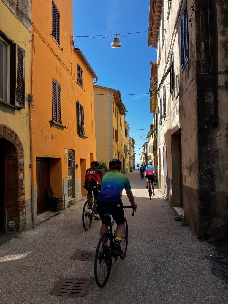 Day 6: North hills, 38 mi, 2825 ft. A big storm is coming that threatens to derail our last day of riding, so as a group we decided to choose the route we wanted to do most from the two that remained: one longer, but flatter, and one shorter, but hillier. Given that we loved the views from yesterday’s ride, we chose hills…and hills we definitely had, beginning with nearly 10 miles of climbing that began with a gentle incline, then got much steeper after about five miles. Like yesterday, the road up the hill was narrow and winding, with hairpin turns that snaked up the hillside, taking us through little hillside villages along the way. After our biggest climb was done, we treated ourselves to a cappuccino break at a lovely restaurant that offered views of Lake Massacciuccoli below. Then, it was time to descend. Normally, the descent is the “dessert” after a hard climb—something to relish and enjoy. However, the hairpin turns meant lots of blind spots where we couldn’t see oncoming cars on the narrow road, plus the road itself was in poor repair in many spots, with large holes and uneven grades. The result was a steep, brake-gripping affair that made my hands cramp and my breaks squeal. Thankfully, with the big descent over, we had several smaller hills and descents to enjoy. It was yet another beautiful day of riding.